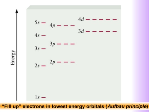 “Fill up” electrons in lowest energy orbitals (Aufbau principle)