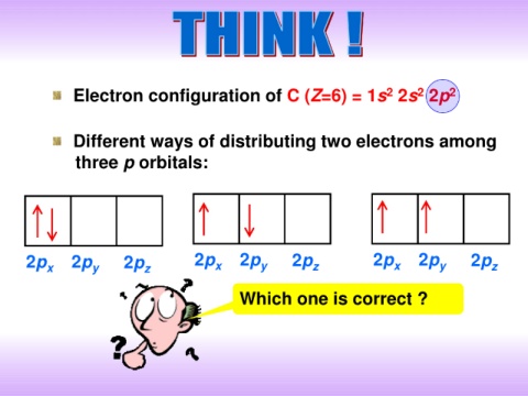 2 Electron configuration of C (Z=6) = 1s 2s 2p 2 2 Different ways of distributing two electrons among three p orbitals: 2p x 2p y 2p z 2p x 2p y 2p z 2p x 2p y 2p z Which one is correct ?