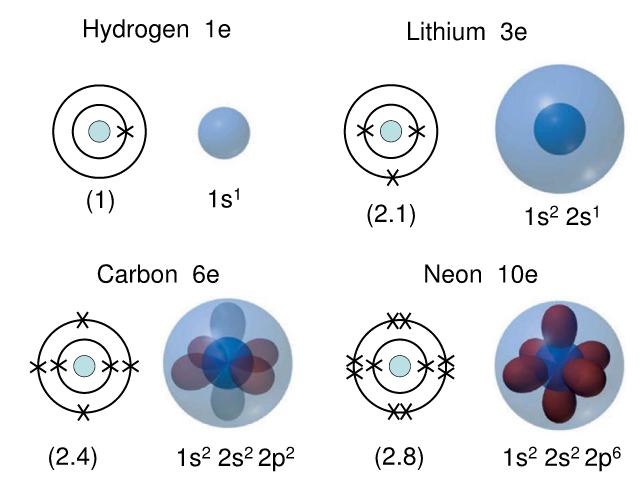 Hydrogen 1e Lithium 3e (1) 1s 1 (2.1) 1s 2s 1 2 Carbon 6e Neon 10e (2.4) 1s 2s 2p 2 (2.8) 1s 2s 2p 6 2 2 2 2