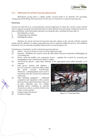 compacting and finishing of the pavement involves use of a fixed form or slip-form paving train.