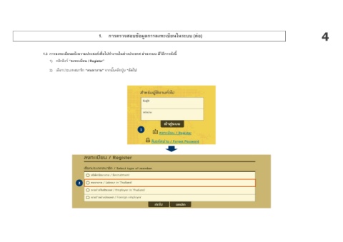 1. การตรวจสอบข้อมูลการลงทะเบียนในระบบ (ต่อ) 4 1.3 การลงทะเบียนแจ้งความประสงค์เพื อไปทํางานในต่างประเทศ ผ่านระบบ มวิธการดังน ี ี ี 1) คลิกลิงก์ “ลงทะเบียน / Register” 2) เลือกประเภทสมาชิก “คนหางาน” จากนั นคลิกปุม “ถัดไป ่ 1 2