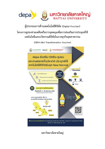 ผู้ประกอบการด้านเทคโนโลยีดิจิทัล (Digital Provider) โครงการคูปองช่วยเหลือหรือการอุดหนุนเพื่อการส่งเสริมการประยุกต์ใช้ เทคโนโลยีและนวัตกรรมดิจิทัลในภาคธุรกิจอุตสาหกรรม (DEPA Mini Transformation Voucher) มหาวิทยาลัยหาดใหญ่