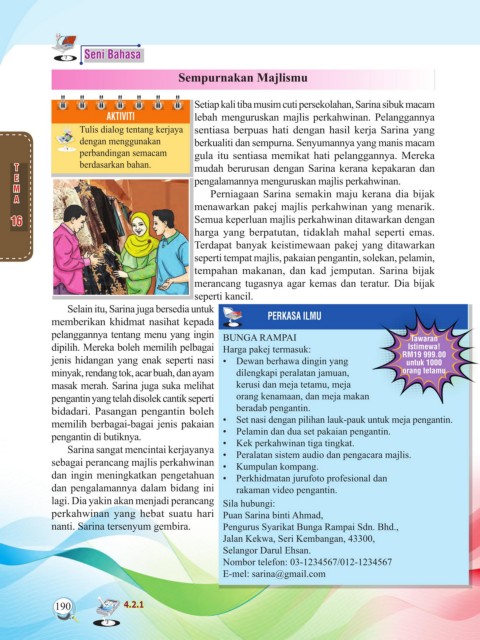 tempahan makanan, dan kad jemputan. Sarina bijak