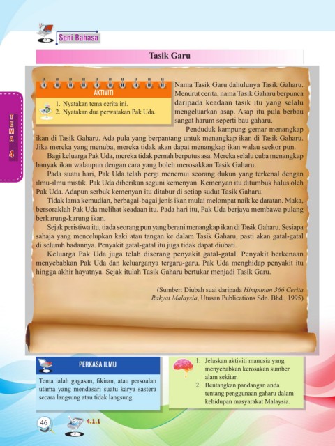 1. Nyatakan tema cerita ini. daripada keadaan tasik itu yang selalu