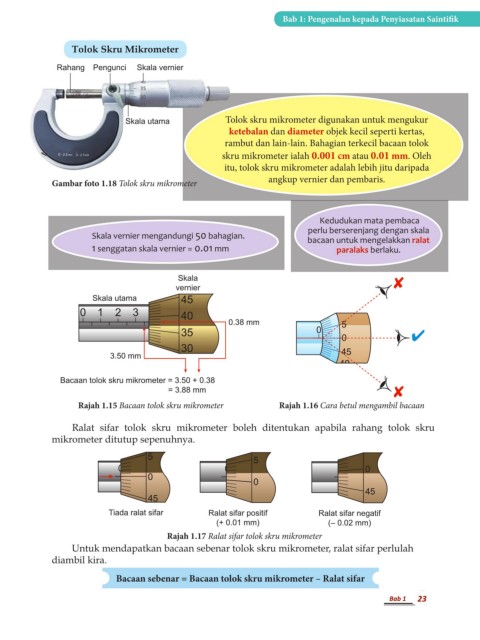 Rajah 1.15 Bacaan tolok skru mikrometer Rajah 1.16 Cara betul mengambil bacaan