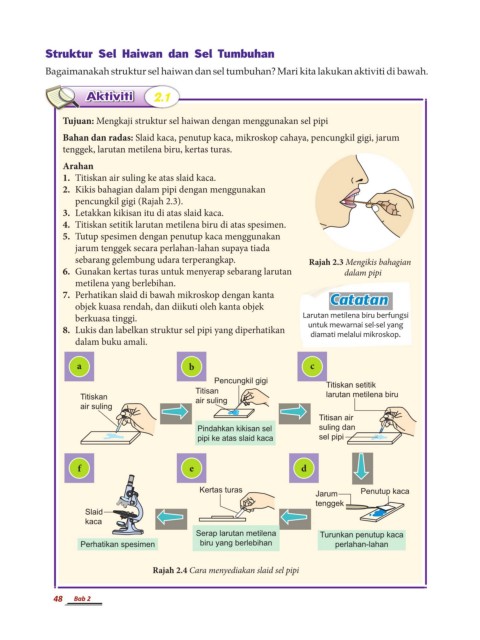 Bahan dan radas: Slaid kaca, penutup kaca, mikroskop cahaya, pencungkil gigi, jarum