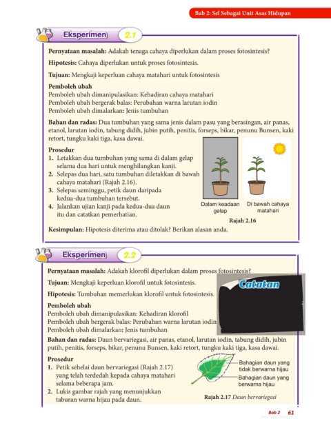Hipotesis: Tumbuhan memerlukan klorofil untuk fotosintesis. Daun bervariegasi ialah daun