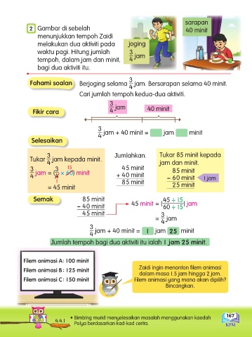 Fahami soalan Berjoging selama jam. Bersarapan selama 40 minit.