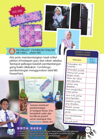 Bimbing murid membuat pembentangan artikel jahitan yang telah dihasilkan.