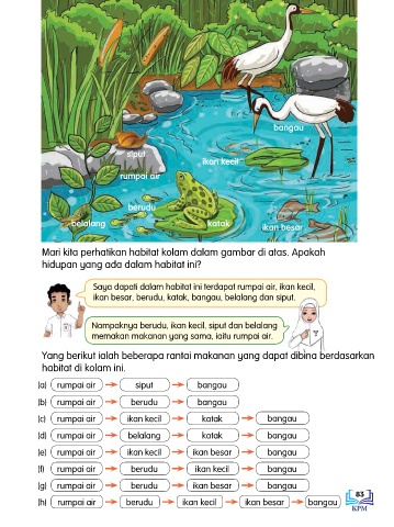 (h) rumpai air berudu ikan kecil ikan besar bangau