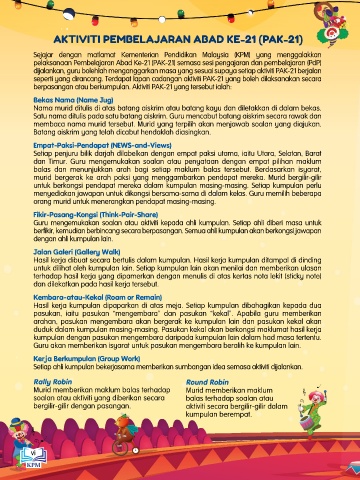 berpasangan atau berkumpulan. Aktiviti PAK-21 yang tersebut ialah: