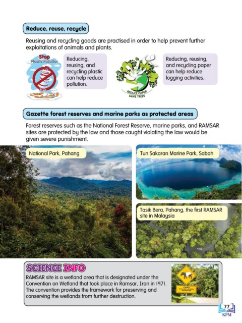 Forest reserves such as the National Forest Reserve, marine parks, and RAMSAR