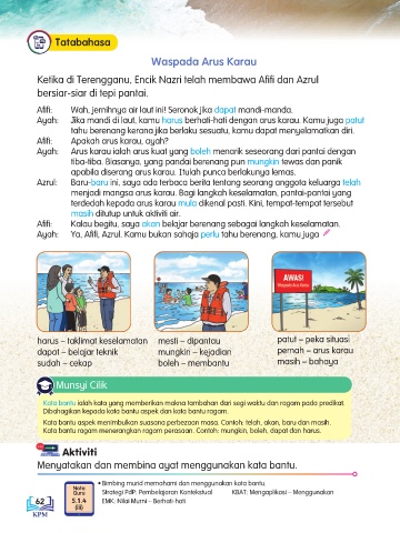 Ayah: Jika mandi di laut, kamu harus berhati-hati dengan arus karau. Kamu juga patut