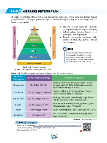 Jadual 14.1 Hierarki petempatan berdasarkan jumlah populasi dan contoh petempatan