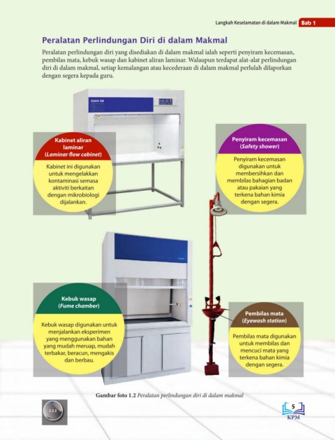 pembilas mata, kebuk wasap dan kabinet aliran laminar. Walaupun terdapat alat-alat perlindungan