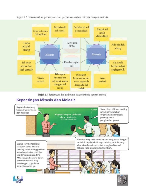 Rajah 5.7 Persamaan dan perbezaan antara mitosis dengan meiosis