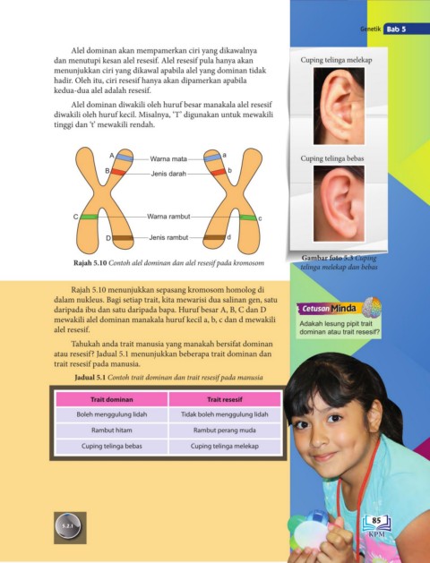 Jadual 5.1 Contoh trait dominan dan trait resesif pada manusia