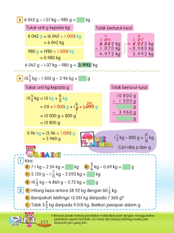 c Tolak 5 kg daripada 9.018 kg. Berikan jawapan dalam g.