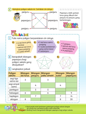 2 1 a b c 2 a b 3 Poligon Bilangan Bilangan Bilangan Bilangan Bilangan sekata sisi lurus penjuru paksi simetri sudut pepenjuru 218 6.1.1